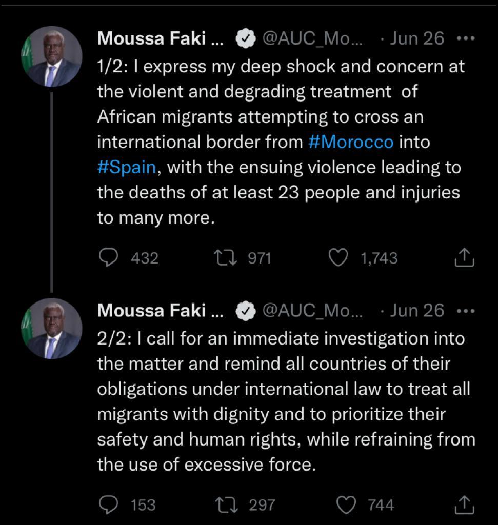 Le Président de la comission de l’Union Africiane, Moussa Faki Mahamat dans un tweet, souligne quant à lui le traitement violent qu’ont subit les migrants africains. Aussi il appelle a une enquête sur la mort de ces derniers.