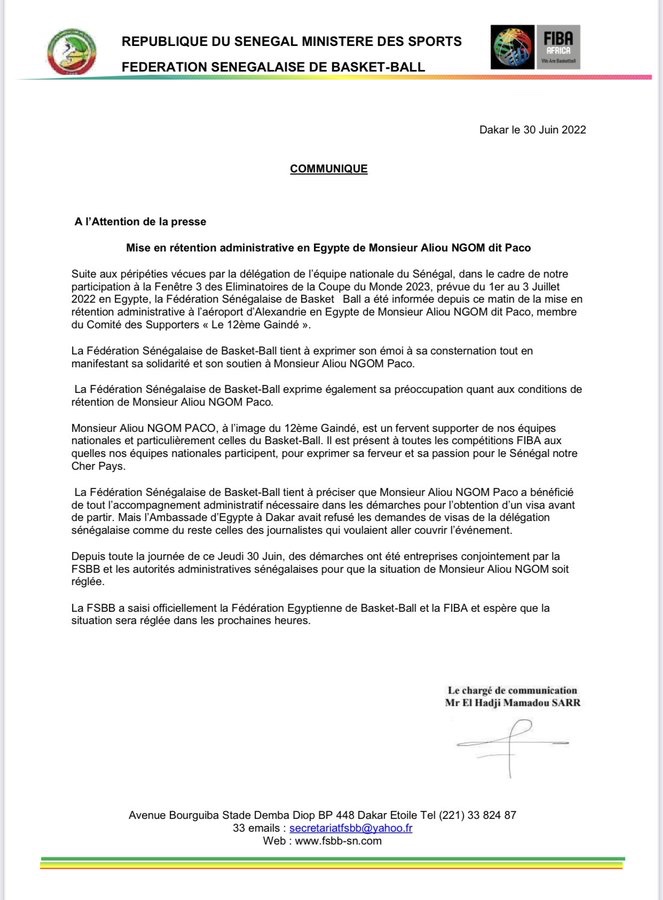 D’après le communiqué de la FSBB, l’Egypte avait refusé le visa à la délégation et même aux journalistes, pourtant, la fédération affirme avoir diligenté toutes les démarches pour l’obtention du visa.